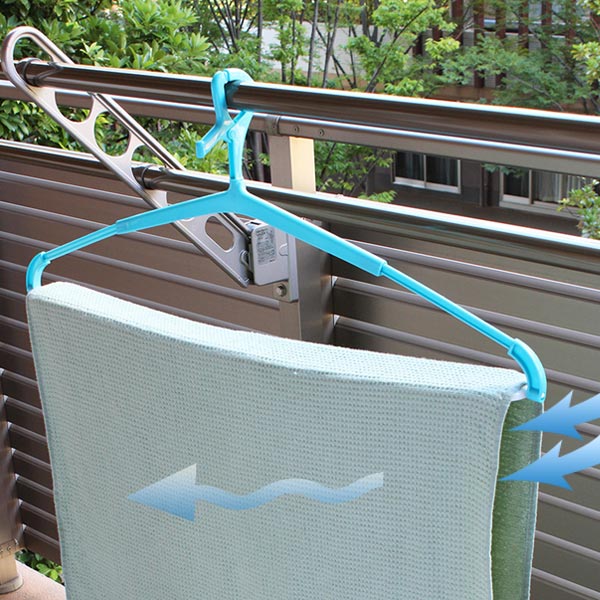 ●厚手のバスタオルも、回転させた2本のアームに渡して干せば、風通しが良くなり素早く乾かすことができます。