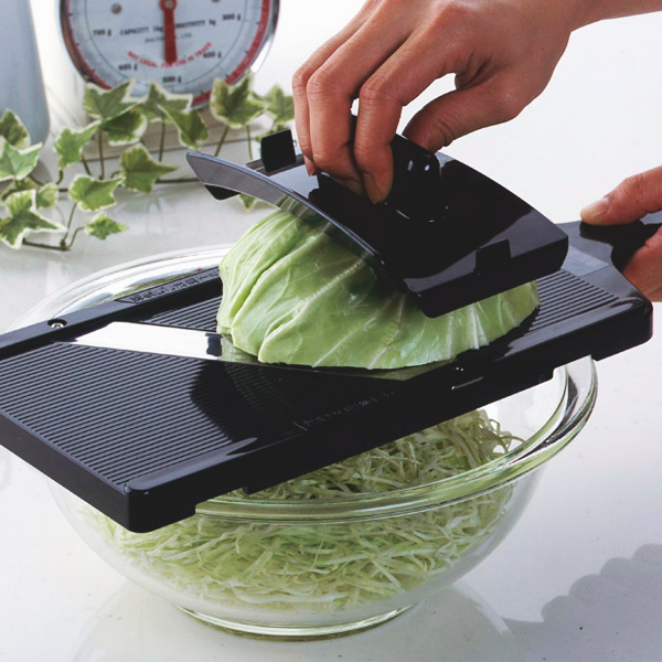 幅広タイプのスライサーでキャベツをカットせずに、そのままスライスできます。包丁と同じ刃付けを施しているので、切れ味抜群。最後まで安心してスライスできる安全ホルダー付きです。