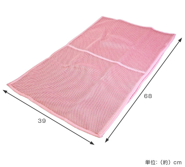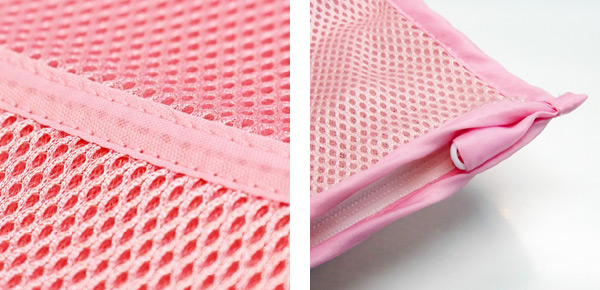 | 2重構造の立体メッシュ 生地に2重構造の立体メッシュを使用しているので、クッション性があり、衣類をガードしながら洗います。また、洗剤カス・糸くずの付着を軽減します。 中身が見えにくいので衣類ポーチとして旅行の際にも使えます。 | ファスナーガード付き ファスナーガードがついているので洗濯中にファスナーが緩んで開くことを防ぎます。 1つのファスナーで2つのポケットの開閉ができます。 | |