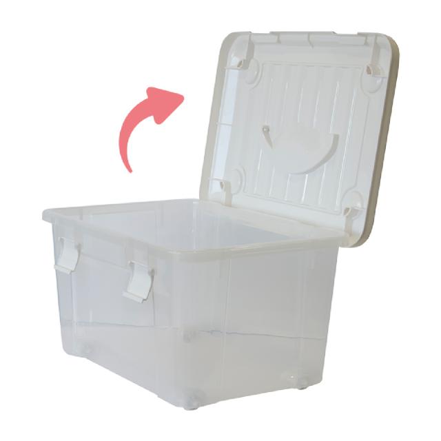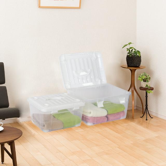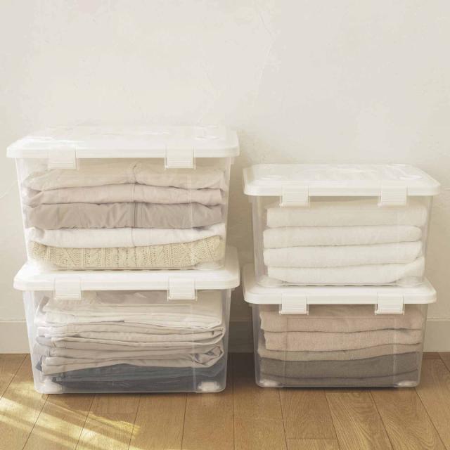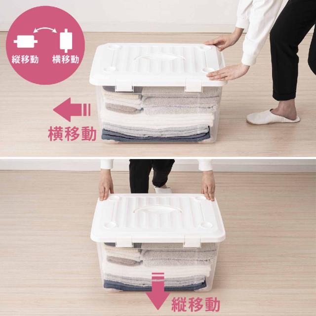衣類の収納や日用雑貨の整理、アウトドア、レジャーにと、色々な用途で使える収納ボックスです。ハンドル付きなので、押入れやクローゼットから取り出す時や別の部屋で使いたい時、屋外に持ち出す時などに便利です。ハンドルはフタのくぼみに納まります。
