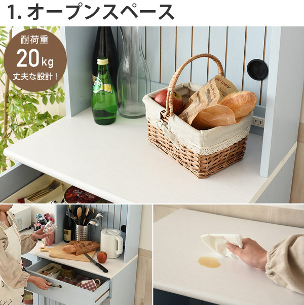 ![]() ![]() 家事のしやすい高さのカウンターにはポットやトースター、炊飯器などが置ける広々とした奥行き。重量のある調理家電や高さのあるものを収納することができます。また汚れや水に強くお手入れが簡単です♪ ![]() 調味料や小物を収納したり自由に活用できるスパイスラック。収納場所としてはもちろんお気に入りの雑貨などを置くディスプレイスペースとしても活用することができます。 ![]() 引き出しにはキッチン雑貨や小物を収納できます。 下段の扉内収納は3.2cmピッチで高さ調節可能な可動棚が3枚付属しております。収納する物に合わせて高さを調節したり、取り外して背の高い物も収納できます。 ![]() 調理家電の配線もバッチリ!合計1500Wの2口コンセントと、配線用のコード穴が付いていてトースターやケトルなど調理家電の配線もスッキリと収納していただけます。作業台としても家事の効率が上がります。また握りやすいアンティーク調の取っ手も可愛いポイントですです♪ シリーズで揃えてかわいいキッチンにやさしい木のぬくもりに包まれたシリーズです。淡いブルーとホワイトのバイカラーが特徴のフレンチスタイル。優しい素材感と丸みのあるフォルム、甘すぎないデザインはどんなお部屋にもマッチします。 実際の色に近い画像となっております撮影状況により、光の当たり具合などで若干商品の色が異なる場合がございます。できるだけ現物と同色となるよう加工している部分がありますので予めご了承ください。 |