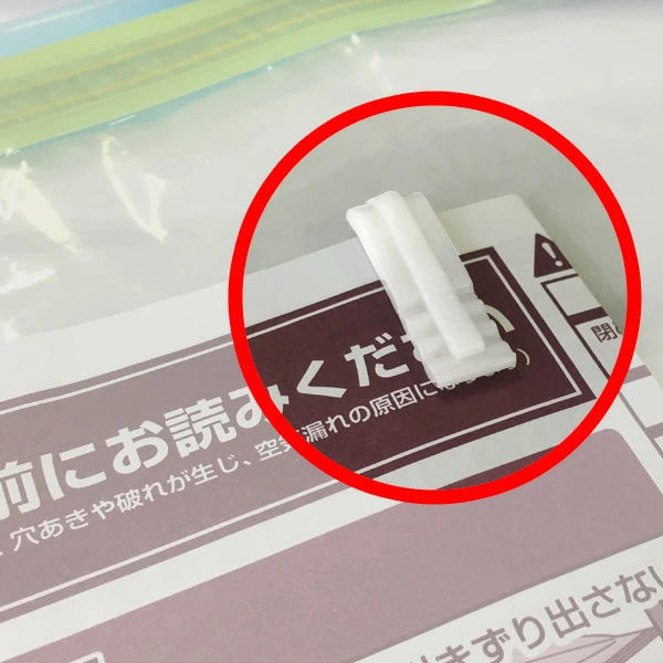 チャックを簡単に閉めるためのスライダーが付属しています。ご使用時はチャックの端から差し込んで取り付けてください。