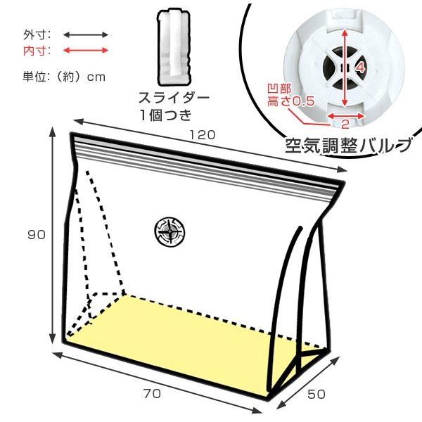 | 備考 | 収納目安(約):シングルかけ布団 1〜2枚、ダブルかけ布団 1枚 ※布団の大きさ、厚み等により異なる場合があります。 ※ハンディやスタンドタイプ、スティック(コードレス)タイプの掃除機では圧縮できません。 ※掃除機の吸引口とバルブが接した際に大きなすき間ができるものは吸引できません。(バルブの吸引口接地部分)の最大径は5cmです) ※スライダーは取り外しが可能です。紛失されませんようご注意ください。 |