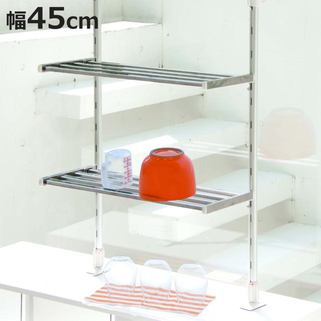 収納ラック つっぱり棚 2段 幅45cm ( シンク上 水切りラック 伸縮 シンク つっぱりラック キッチン 収納 突っ張り 水切り 突っ張り棚 突っ張りラック シンクサイド キッチン収納 壁面収納 収納棚 高さ調節可能 ステンレス )