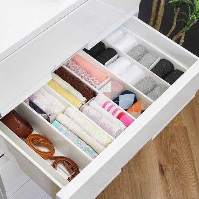 散らかりがちな引き出し内をキレイに整理整頓できる仕切りボックス10個セットです。ブラジャー、ショーツ、トランクスなどの下着類やスカーフ、ベルト、ハンカチなどの収納に最適で、サッと取り出せて便利です。付属の仕切り板は可動するので、収納物のサイズに合わせて調節ができ、きちんと立たせて型崩れを防ぎます。