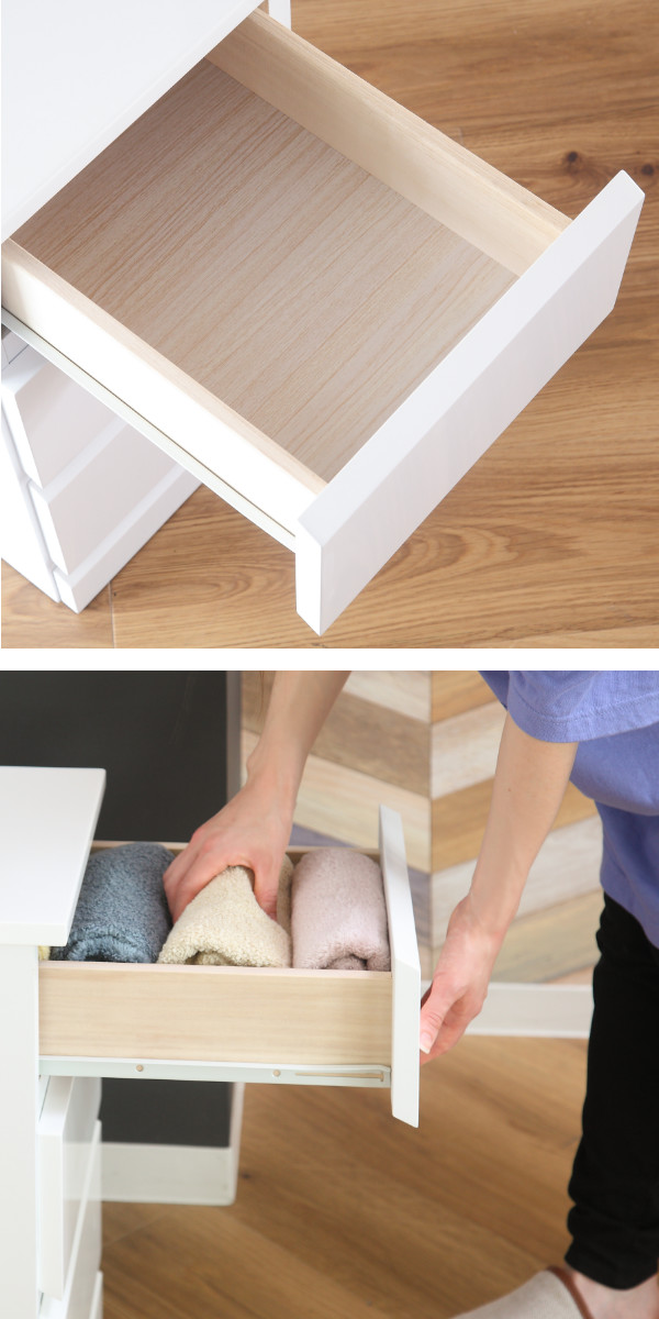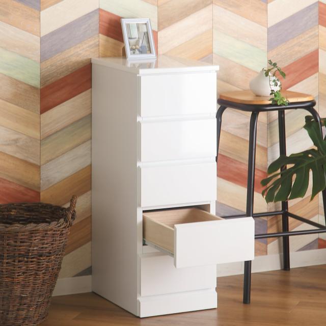 お部屋がパッと明るくなるホワイトカラーのスリムチェストです。幅約30.5cmのスリムなチェストは子供部屋や一人暮らしのお部屋でも邪魔にならずご使用いただけます。