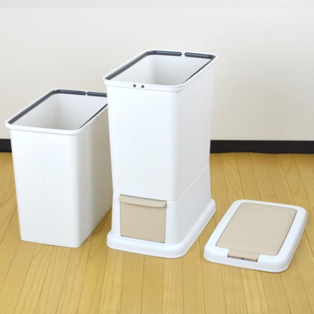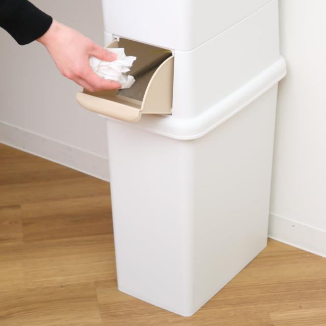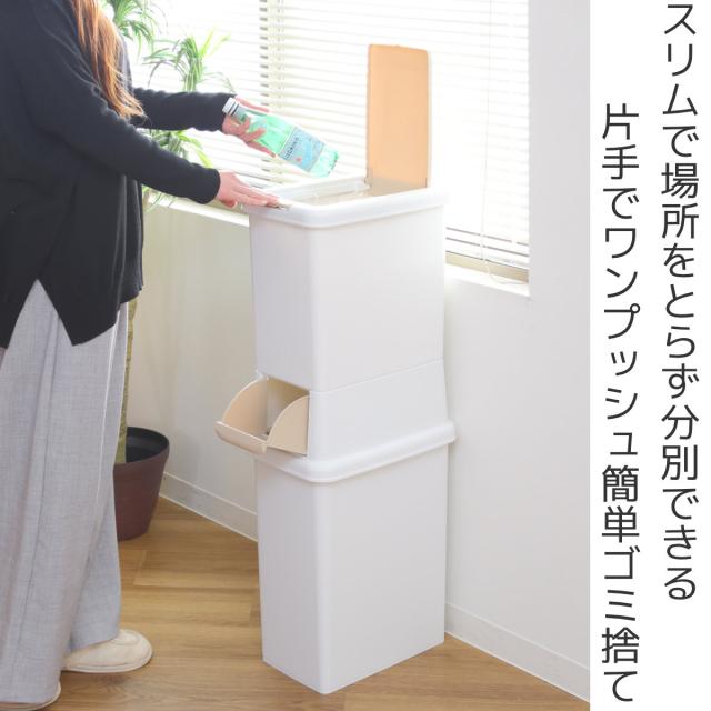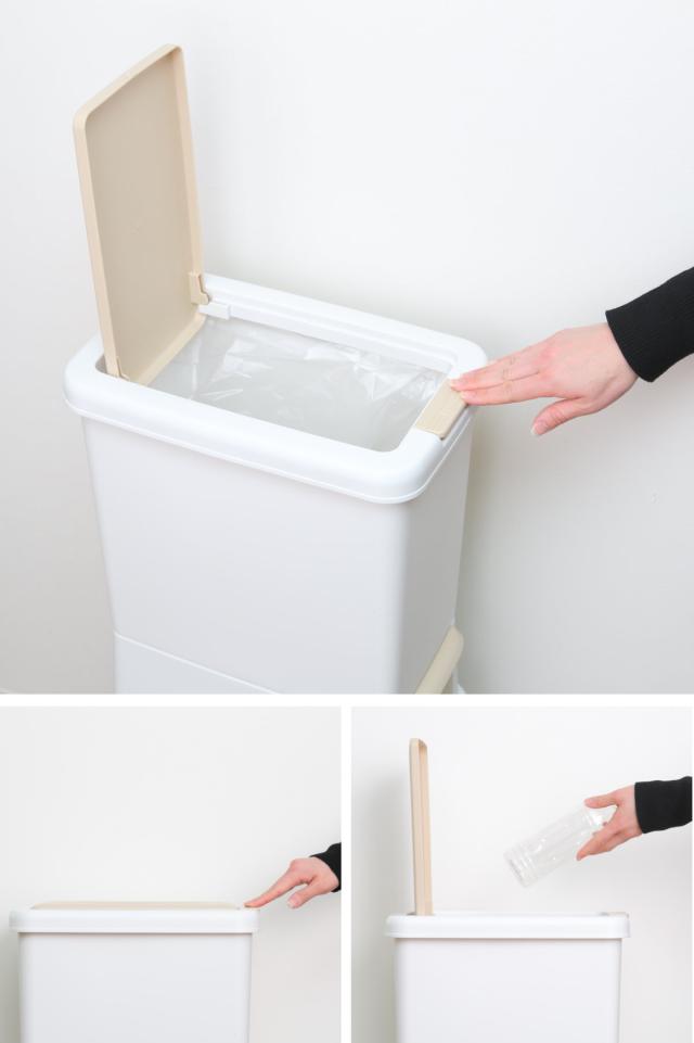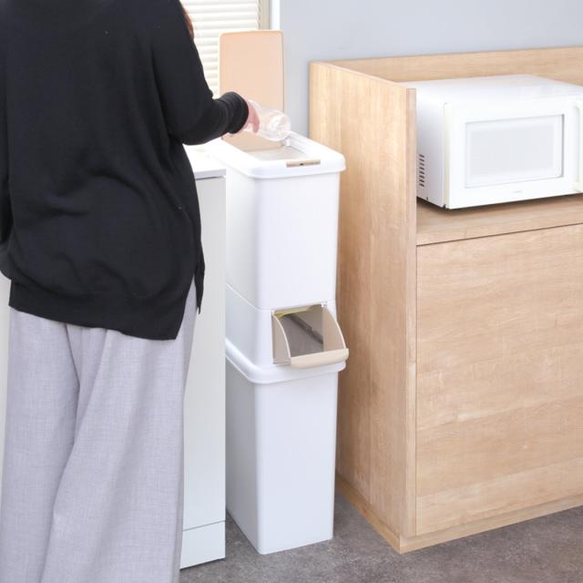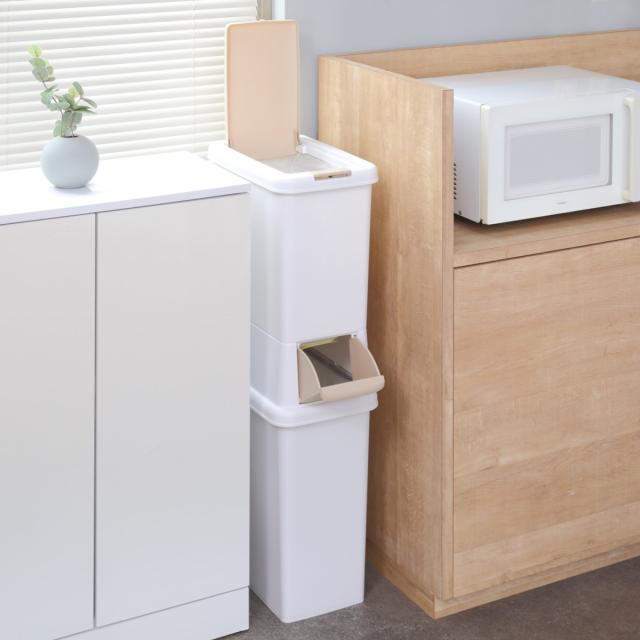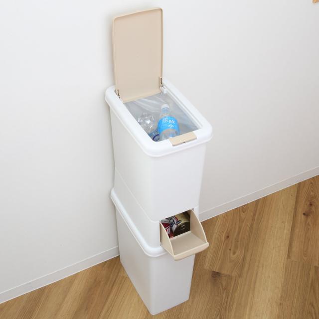 分別に便利な2段式のダストボックスです。上段に21L、下段に26.5Lの合わせて47.5Lのゴミが収められます。たっぷりサイズなのにスリムで縦型なので、場所をとらずに設置できます。生ごみや燃えるごみは上段に、空きビンや缶などは下段になど、ご自由に分別できます。