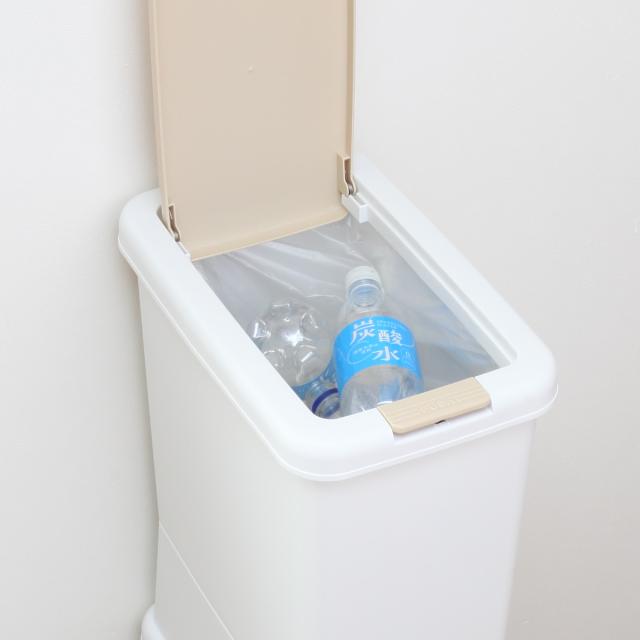 下段はペットボトルや空き瓶、空き缶などが捨てやすいフラップ式の投入口です。広口で2Lサイズのペットボトルも捨てられます。