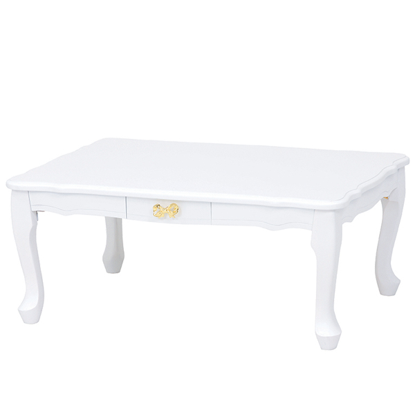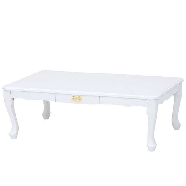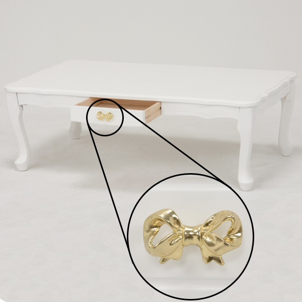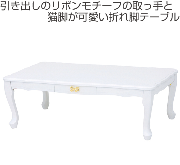 ローテーブル 折れ脚テーブル 引出し付 姫系 ロマンチック リボン型引手 フェミニン 幅100cm ( 猫脚 白家具 クラシック かわいい 女の子 プリンセス 折りたたみ 収納 省スペース 子供部屋 収納付き )