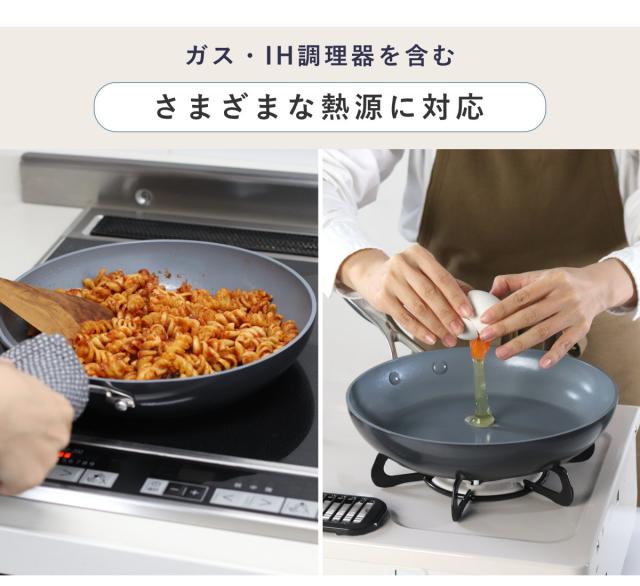 ガス・IHクッキングヒーターなどあらゆる熱源でお使いいただけます。高温で調理しても底が変形しにくいため、熱源を選びません。