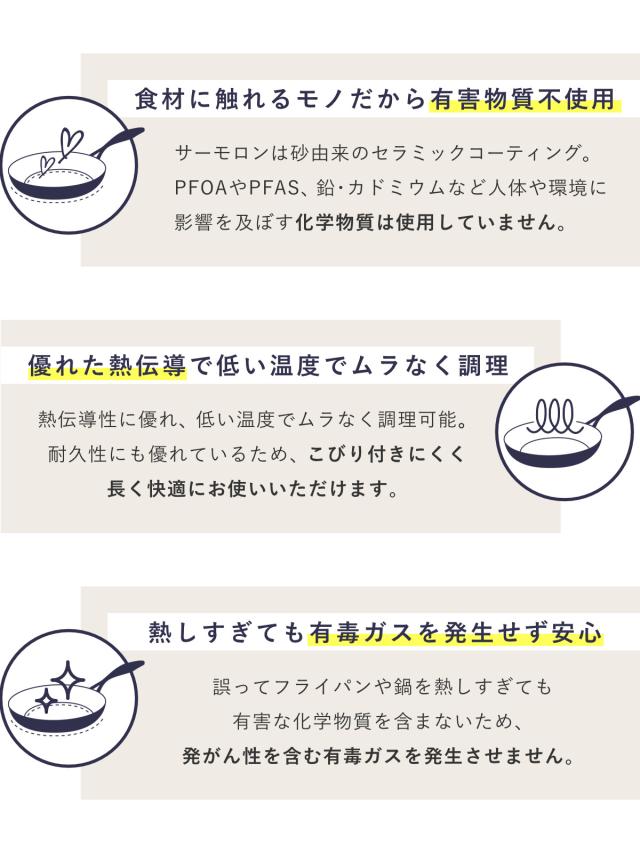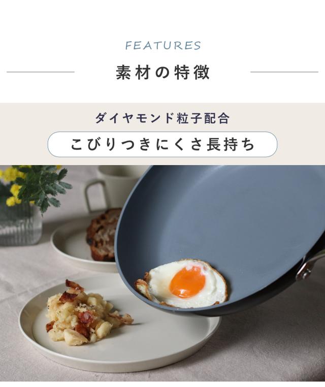 | 材質 | 本体:アルミニウム合金 表面加工(内面・外面):セラミックコーティング 底面:金属溶射構造 ハンドル:ステンレス鋼 |