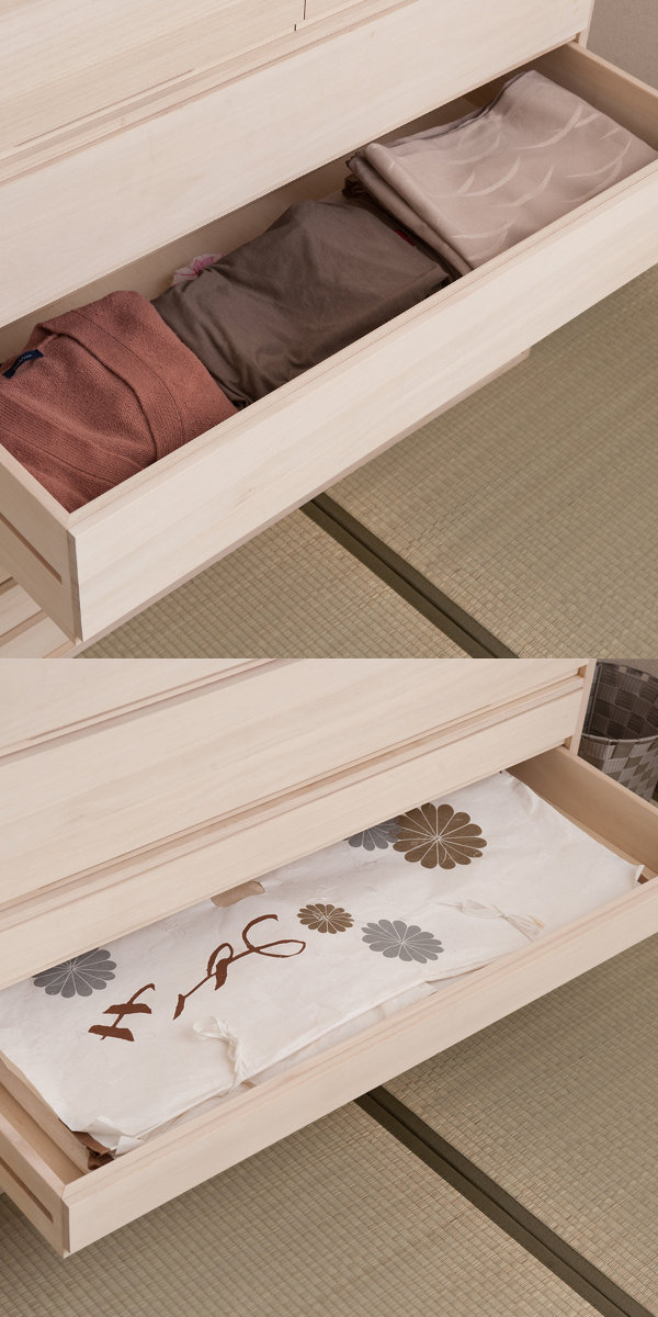 上段は洋服の収納、下段は着物の収納に。ひとつのたんすに収納できる優れものです。着物は二つ折りのたとう紙にいれたまま収納できるサイズです。