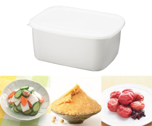 浅漬けや梅干し作りに利用したり、みそやお米の保存容器としても使えます。キッチンを邪魔しないシンプルなホワイトカラーなので、様々な用途で活躍します。