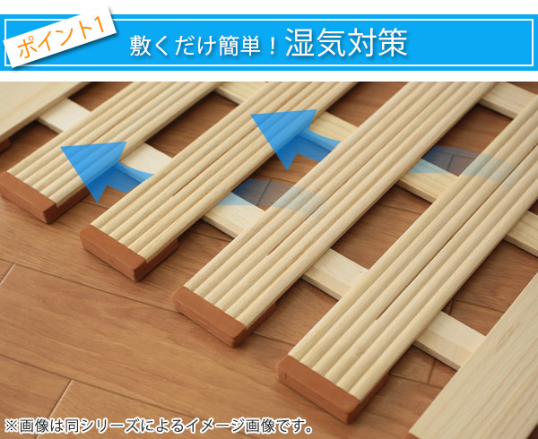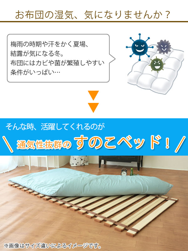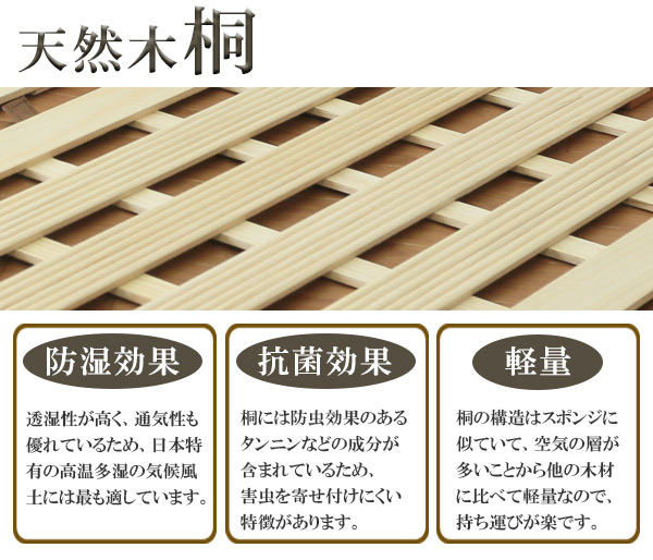 調湿性に優れ抗菌作用を持つ桐でつくられたすのこベッドをお布団にプラス1枚するだけで、簡単に湿気対策でき年中清潔・快適です。すのこが風の通り道をつくり、湿気やカビから布団や床を守ってくれます。