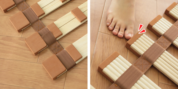| 安心・安全設計 釘やタッカーなどを一切使用していない安全設計です。床を傷つけない樹脂性クッションがついており、長くお使いいただけるように配慮しています。 | イタッ!を改善 夜中に起きて立ち上がると・・・「イタッ!」を改善しました。優しい樹脂性クッションがすのこの板側面をカバーしています。 |