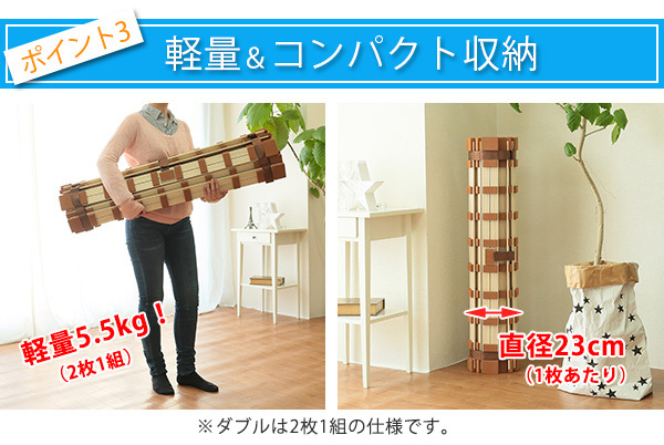| 軽量ラクラク持ち運び 約5.5kg(2枚1組)の軽量タイプです。女性でも扱いやすい重さで移動も簡単です。 | 丸めてスッキリ収納 直径23cm(1枚あたり)なのでちょっとした隙間にコンパクトに収納できます。 |