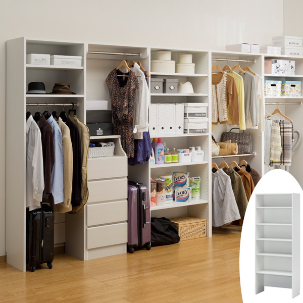 空いた空間をクローゼットに変えることができる大型収納シリーズ。収納物に合わせて選べる3つの収納タイプの棚をご用意しました。別売品の1cm単位でサイズオーダーできる連結ハンガーパイプや60cm幅のラックと組み合わせて壁面ピッタリに!