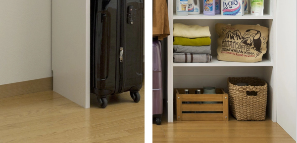 | 巾木よけ 巾木をよける仕様のため、壁にぴったり設置できます。 | 出し入れしやすい構造 収納BOXの出し入れがしやすい、地板がない構造です。 |