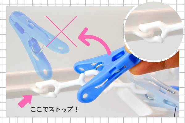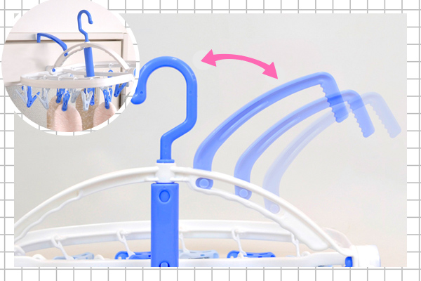 室内干しフックによって、ドアなどに掛けても水平に保つことができるので、洗濯物の乾きムラを防げます。