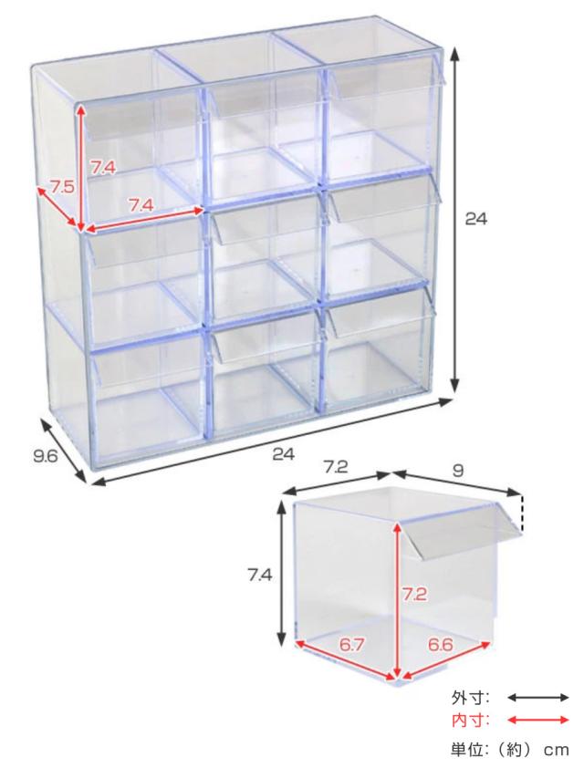 | サイズ | 外寸:約 幅24×奥行9.6×高さ24(cm) 内寸:約 幅6.6×奥行6.7×高さ7.2(cm) ※内寸は引出し1個あたりのサイズ |