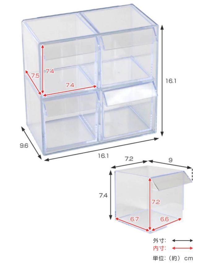 | サイズ | 外寸:約 幅16.1×奥行9.6×高さ16.1(cm) 内寸:約 幅6.6×奥行6.7×高さ7.2(cm) ※内寸は引出し1個あたりのサイズ |