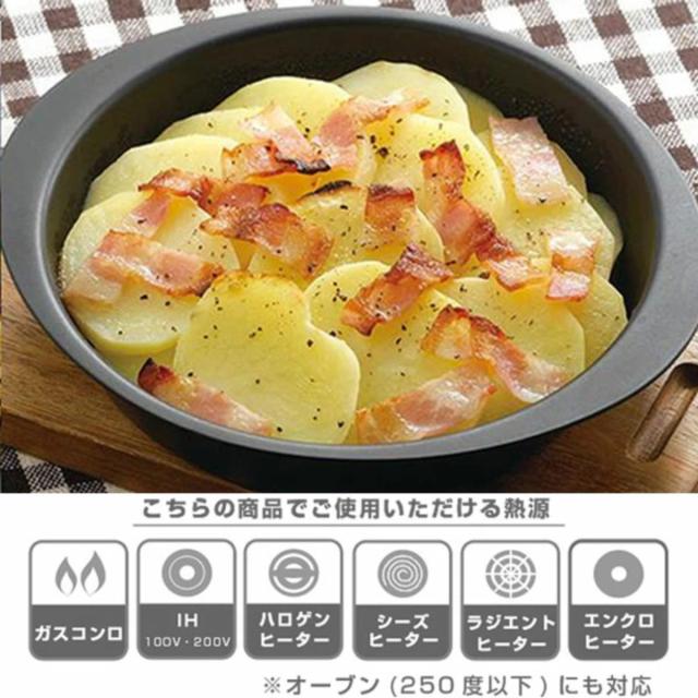 ガスはもちろん、IHやオーブン調理(250度以下)にも対応しています。使う場所を選ばず、調理後そのまま食卓に出すこともでき、アツアツをいただけます。