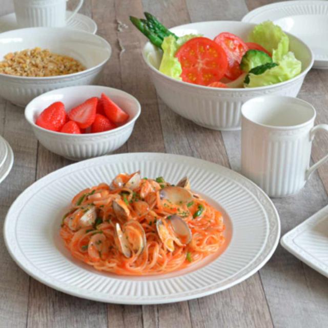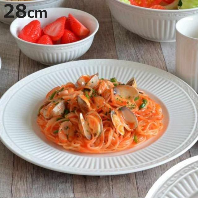 直径28cmで、メイン料理や、サラダや副菜を一緒に盛りつけたワンプレートランチなど、幅広く活躍するサイズです。清潔感のあるホワイトカラーが、様々な料理に馴染みます。
