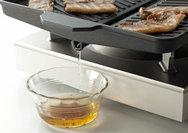 お肉の余分な脂を落とす溝付きプレートを採用しています。油を溜めないことで、野菜を焼く時に油の飛び散りを抑えます。約300gのお肉を焼いて、約50mlの油が流れます。