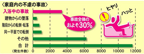 家庭内での不慮の事故のうち、およそ30%入浴中に発生しています。浴室・浴槽内では足元や手元が滑りやすくなります。