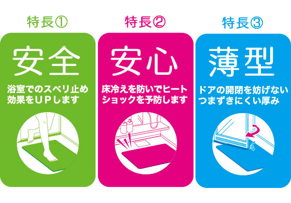 浴室でのスベリ止め効果をUPし、床冷えを防いでヒートショックを予防、ドアの開閉を妨げない、つまづきにくい厚みでとてもバリアフリーなバスマットです。