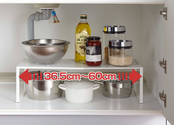 スライドさせて幅を36.5cmから60cmまで伸縮可能です。シンク下や引き出し内、カウンター上など、収納場所に合わせて使い勝手良く設置ができます。