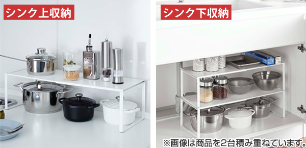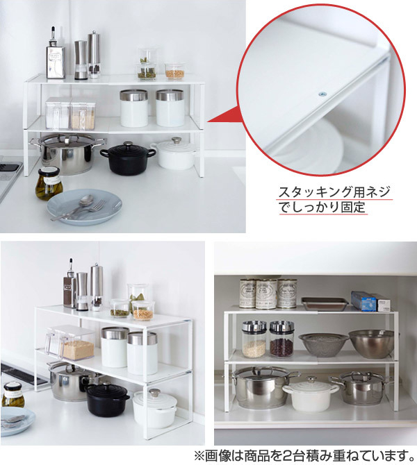 同じキッチンラックをスタッキングすることで、さらに収納力がアップし、シンク下のデッドスペースも有効活用することができます。付属のスタッキング用ネジでしっかり固定できるので安心です。