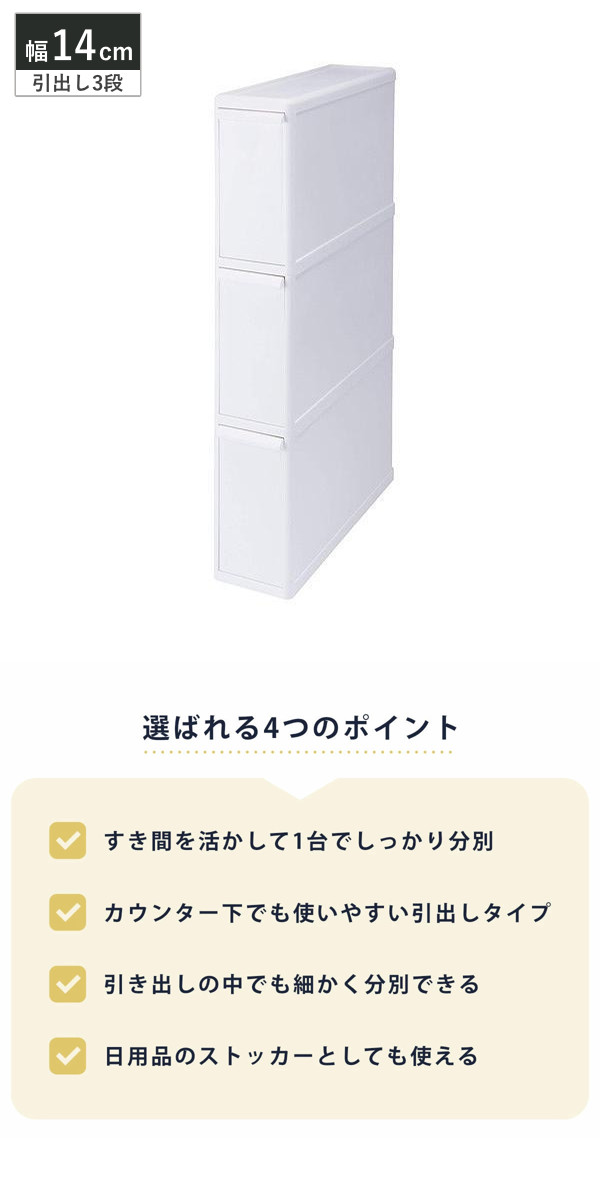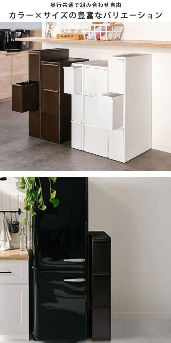 キッチンだけでなく、洗面台と洗濯機の間などでも使用可能で、ゴミ袋・洗剤・食品・ペットボトルなどの収納にもおすすめです。