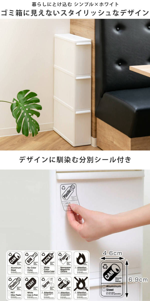 冷蔵庫や食器棚の横にあるちょっとした隙間にも収まる幅14cmのスリムなゴミ箱です。縦型のゴミ箱なので、キッチンのデッドスペースを有効活用して、1台でしっかり分別ができます。