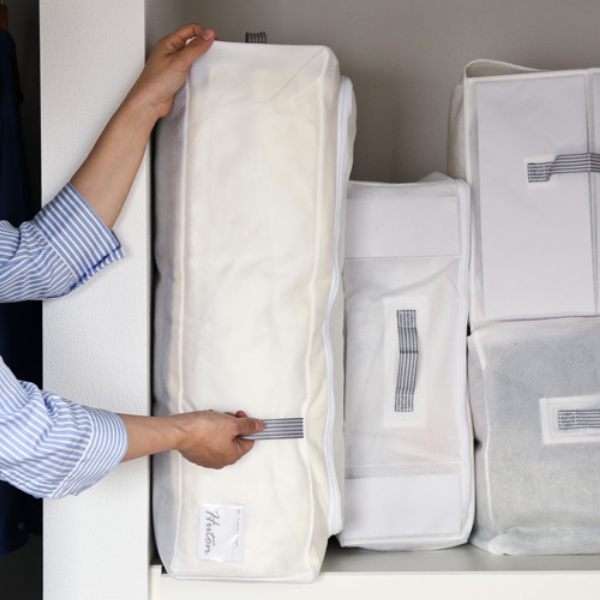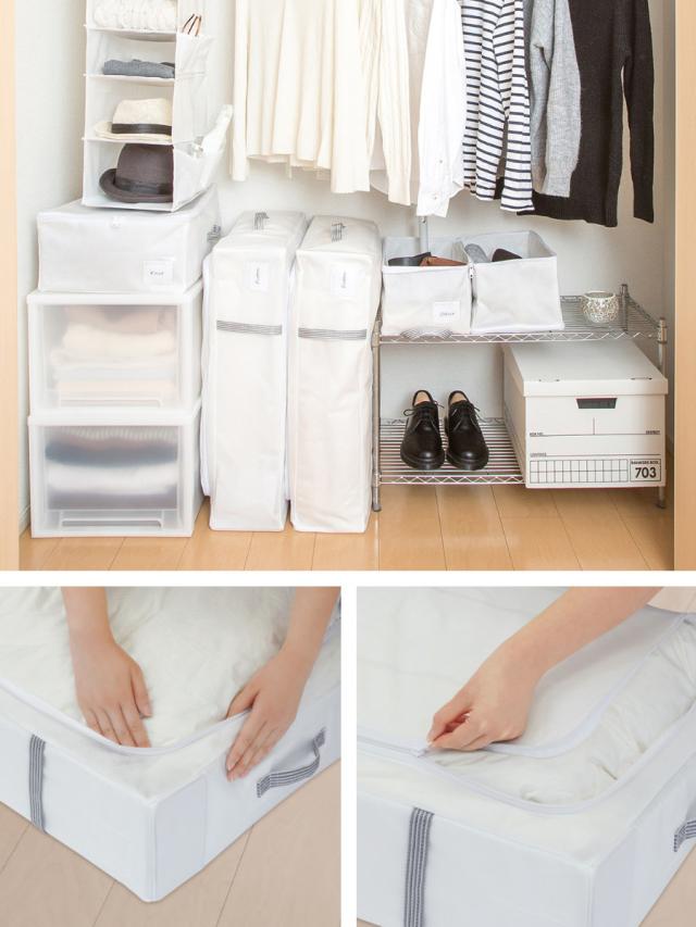 かさばる布団をクローゼットのすき間に立てて収納できる布団収納袋です。少し内側にファスナーがあることで収納しやすく、布団をはさまずスムーズに開閉できます。