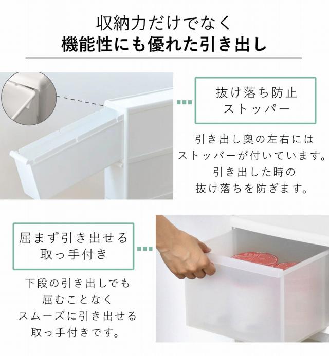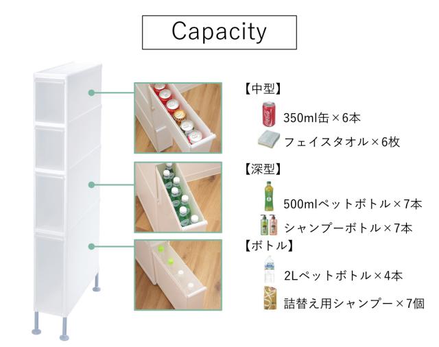 | 引き出し1段あたり耐荷重 | 中型・深型:約 5kg ボトル:約 10kg |