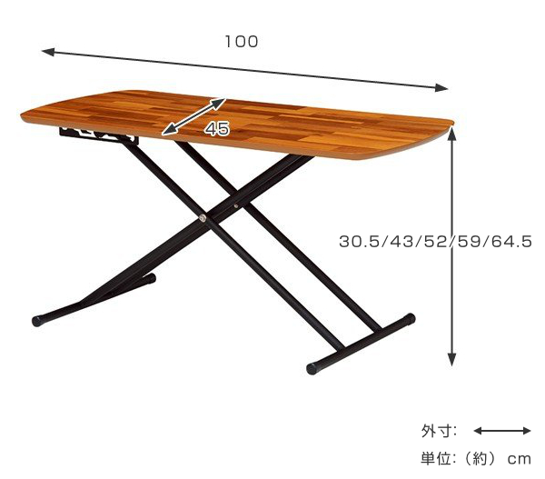 | サイズ | 約 幅100×奥行45×高さ64.5(cm) 高さ5段階調節可能:30.5、43、52、59、64.5(cm) |