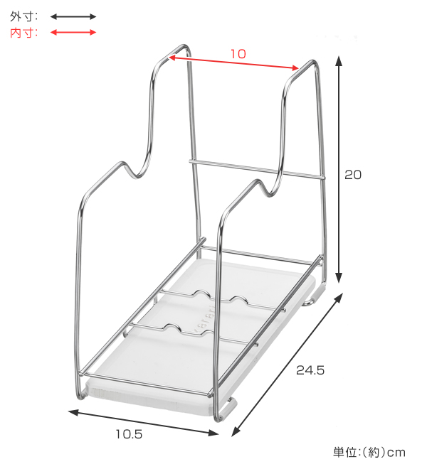 水アカや汚れに強いステンレスのワイヤーと吸水に優れた珪藻土を組み合わせたどんなキッチンにも馴染むシンプルなデザインのフライパンラックです。水切りカゴに入りきらないフライパンもすっきり収まり乾燥することができます。