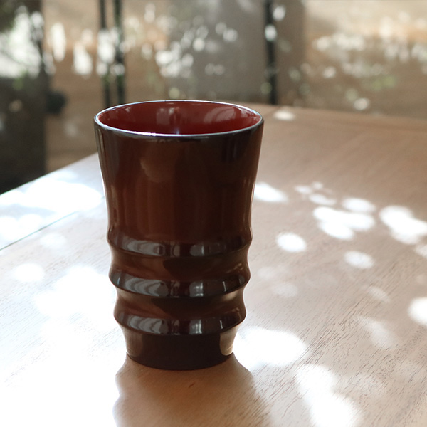 ●外側が透明な漆(=透き漆)を塗って仕上げた溜塗、内側が朱で塗られた木製カップです。
