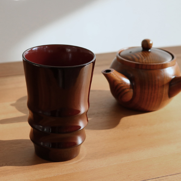 外側が透明な漆(=透き漆)を塗って仕上げた溜塗、内側が朱で塗られた漆塗りのカップです。漆塗りは使えば使うほど艶が増し、味わい深くなっていきます。上品な艶感は、おもてなしにも最適です。
