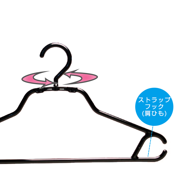 フックは洗濯にも収納にも便利な360度回転で、ストラップフックもあるのでタンクトップやスカートなどのハンガーループも掛けられます。