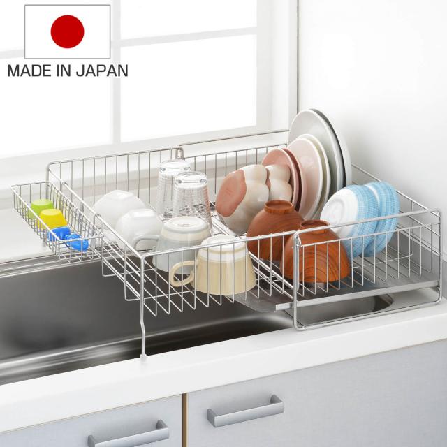水切りラック シンクサイド 幅の広がる水切り 幅26cm×奥行47cm ( 日本製 ステンレス カトラリーポケット付き シンク上 スリム 伸縮 水切りかご 水切り 大容量 水切りカゴ ステンレス水切り 水切りバスケット 水が流れる )