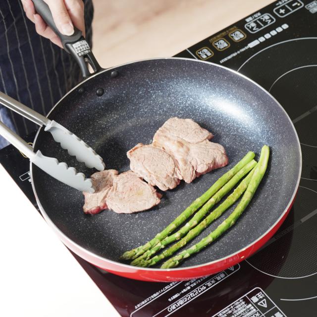 赤色の大きなフライパンは、調理中だけでなく、使用していないときでもキッチンの主役になります。鮮やかな赤の背景によって、焼き魚やステーキ、彩り野菜の色がいっそう引き立ち、いつもの家庭料理がまるでレストランの一皿のように格上げされます。