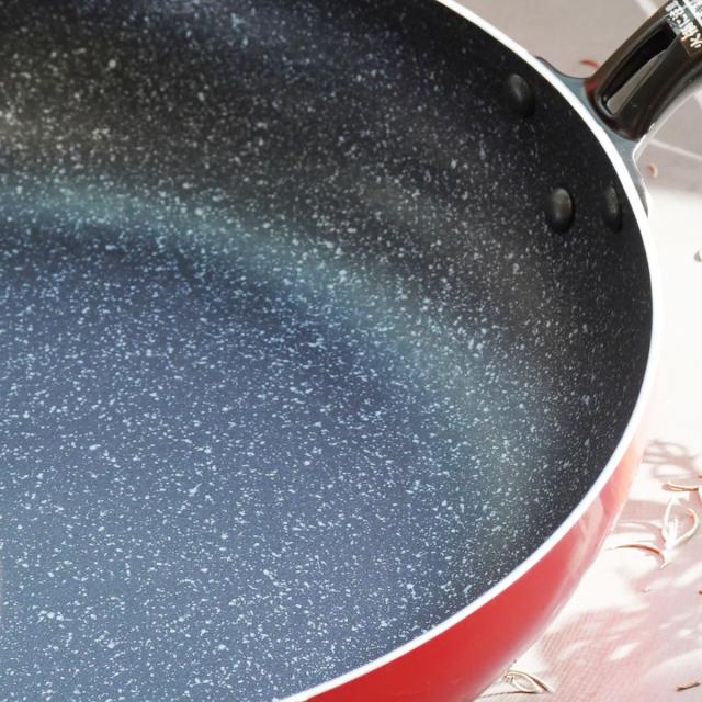 直径33cmの超ビックサイズのフライパンです。内面は優れた耐久性でキズに強い、ダイヤモンド粒子配合の内面4層構造のマーブルダイヤモンドコートで、金属ヘラも使えます。