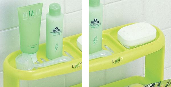 | フラット設計の上段 上段は小物が立てておけるフラット設計です。底には穴が空いているので水が溜まりにくいのも便利です。 | 石鹸置き場も確保 スペース毎に分けて小物をすっきり収納できます。石鹸置き場もこのラック内で確保でき、取り出しやすく、バスグッズの収納が省スペースで済む便利ラックです。 |
