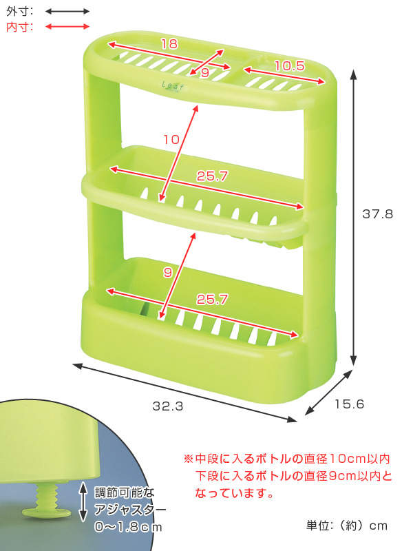 | 斜めに置けるシャンプーボトル 下2段は斜めに収納することで省スペースを実現しました。シャンプーボトルは斜めに置けるので棚の天板に手が当たらず、シャンプーが出しやすくなっています。 | 4つのアジャスター付 傾斜のある浴室でも安定よく使えるアジャスター付きです。 アジャスターは約18mmまで調節可能です。 |