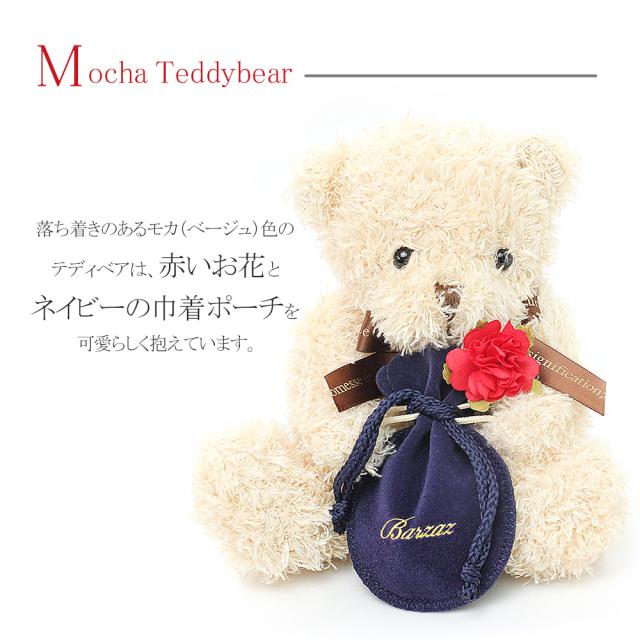 ちょこんと座るベアは、ネックレスが入った巾着ポーチと一輪の花を抱えています。