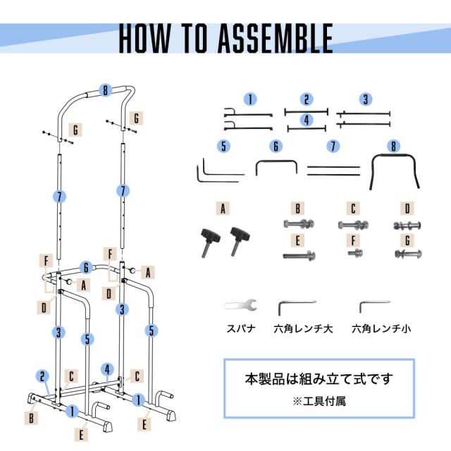 - 説明書が分かりやすいです。本体には番号とネジには記号がふってあるので30分位で組み上がりました。 ぶら下がりだけでなく他の運動も色々と出来るのでとても良いと思います。