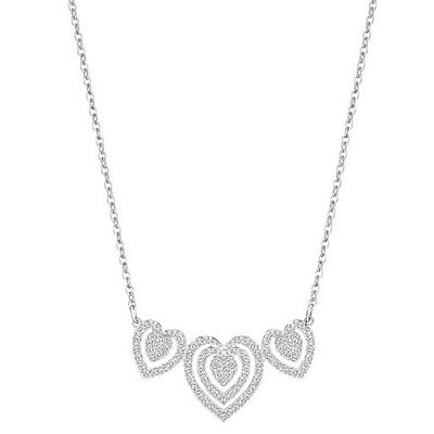 スワロフスキー『Carol ネックレス』です。フェミニンでロマンチックなデザインが、ホワイトデーギフトなどさまざまなシーンにぴったりなネックレス。繊細な3つのハートモチーフにロジウムコーティングとクリスタルのパヴェを施しています。他のネックレスとの重ね付けをして、あなたらしさとトレンドをミックスさせたスタイルをお楽しみください。