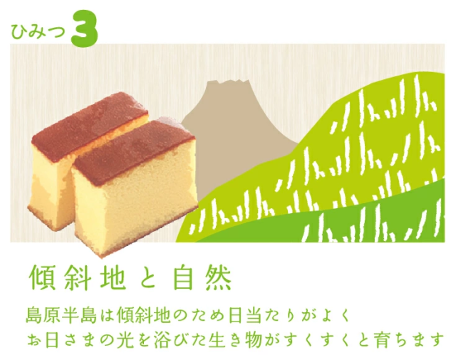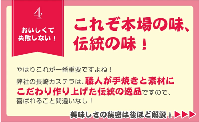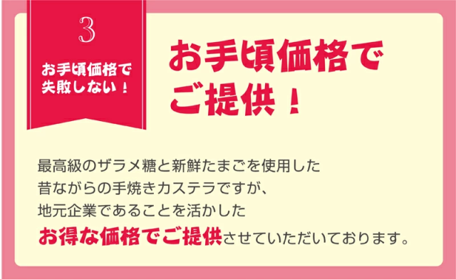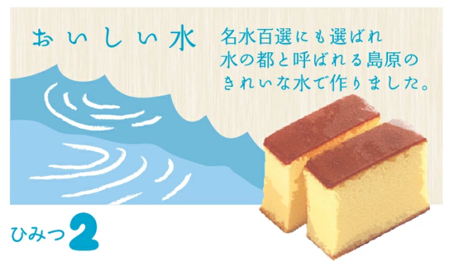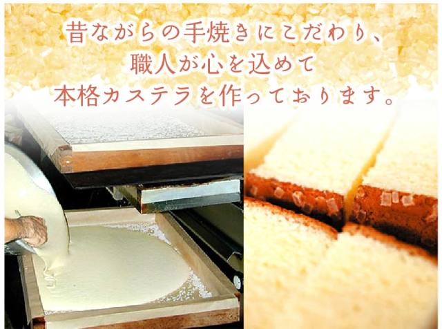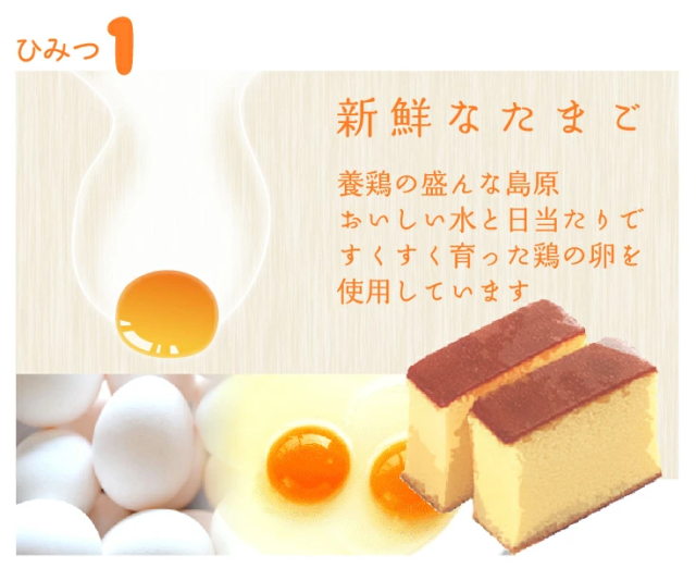昔ながらの「 手焼き 」にこだわり、最高級 のザラメ糖や雲仙普賢岳のふもとで採れた新鮮 たまご などの厳選した材料を使用し、長崎の伝統の味を守り続けています。もちろん 無添加 です。